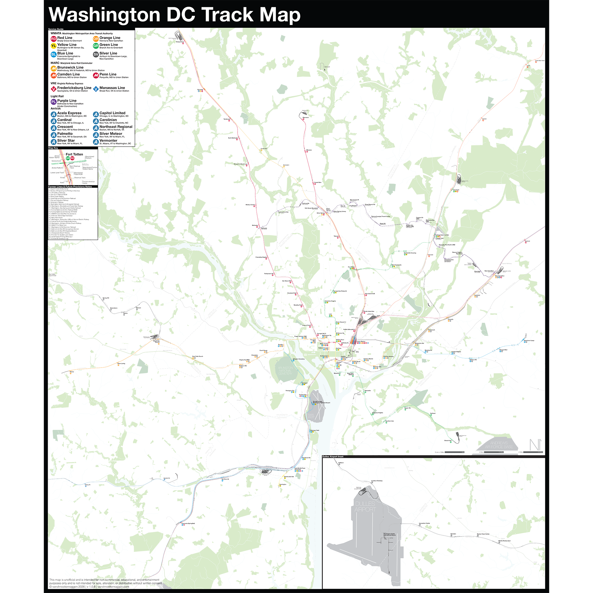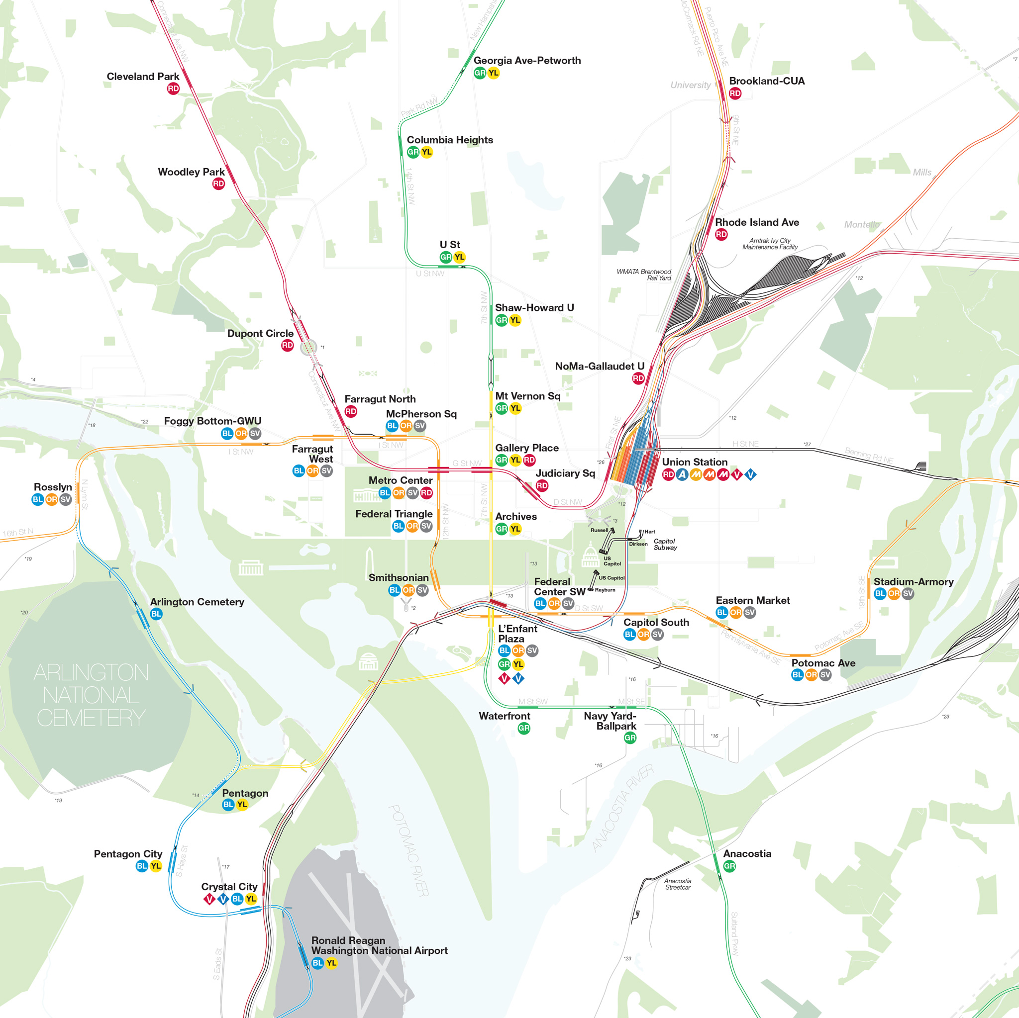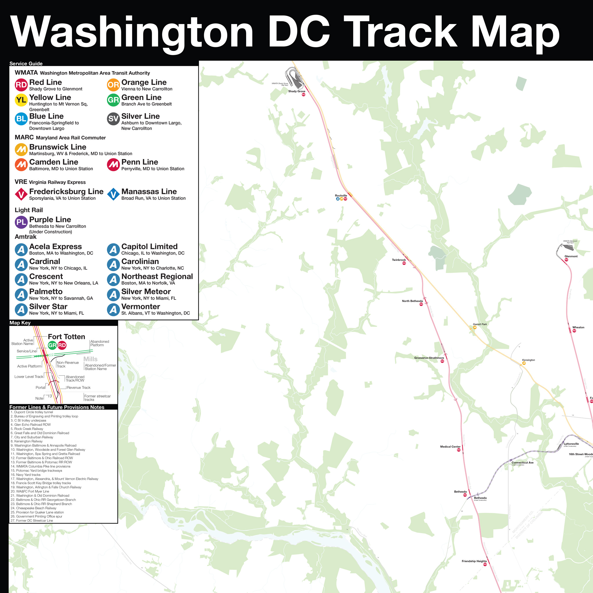 The Complete and Geographically Accurate track map of Washington DC is a new, detailed look at the entire rail network that most riders never see. Unlike a traditional subway map which just shows train routes, stations, and a simplified geography for easier navigation, the Track Map shows how the system actually looks; each track, each switch, each station platform, and each train yard is shown in a clear and clean design. While the Track Map offers a service guide, it is not intended to replace the subway map as a wayfinding tool. The Track Map shows the paths of the tracks so that the viewer can see how trains are able to run. If you’ve ever wondered why certain trains don’t run to certain places, this map will tell you why.